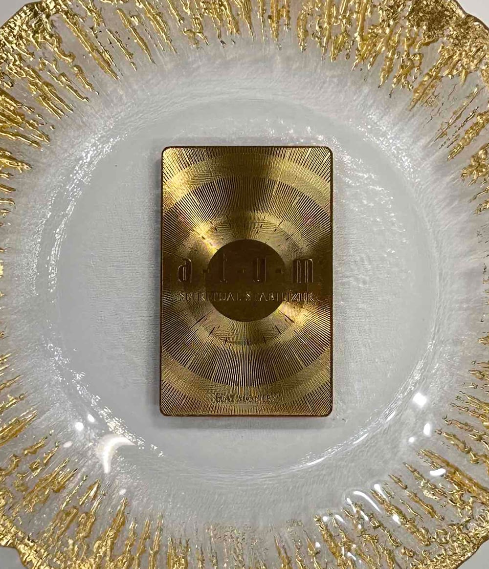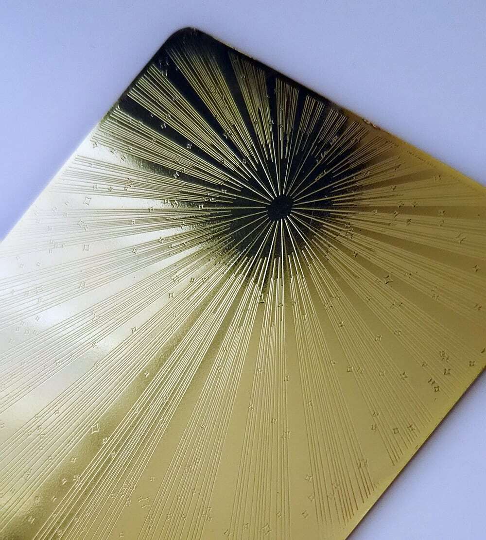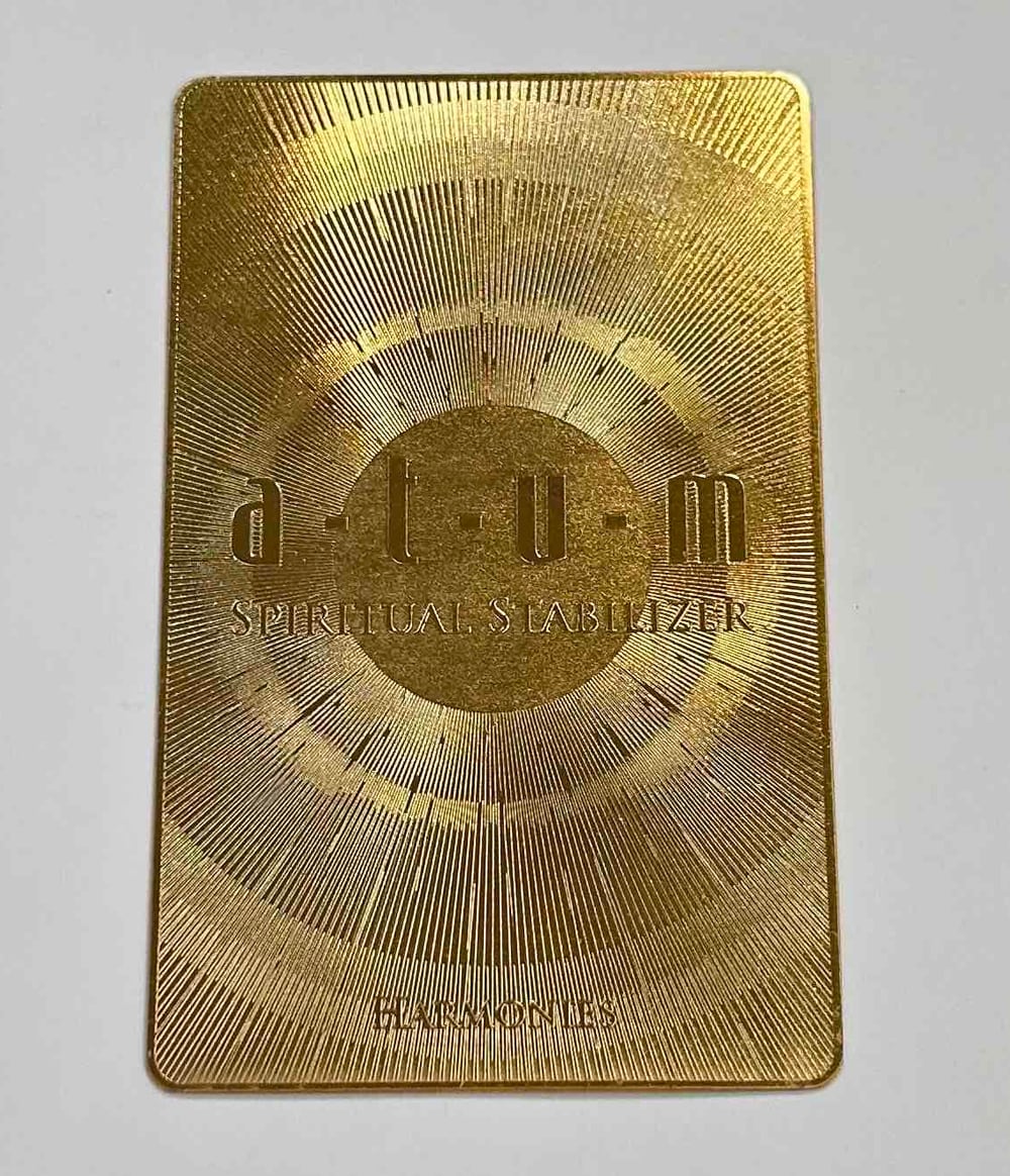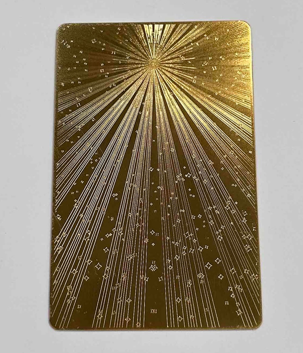 この太陽のカードは、素材となる黄銅(真鍮)に、微細な絵柄加工を行い、さらに金メッキを施します。その後、特殊セラミックを応用しさらにプラズマ放電をかけて、量子力学的な加工を行います。これを一定期間連続して処理し、カードを宇宙エネルギーに直結させることで完成します。