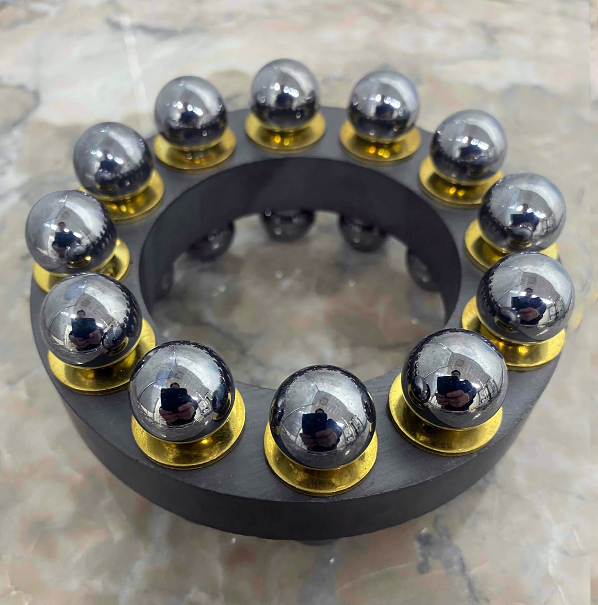 素材:フェライトマグネット(フェライトカラーのダークグレー)・シルバーテラヘルツ球(直径約15mm)24個・ステンレスおよび黄銅リング計24個、大きさ:直径100mm・内径60mm、高さ45mm、重さ:533.5g 全体を一次量子加工済み、設置保護用ゴム板・取扱説明書付、保証期間:常識的な使用の範囲内において3年とさせていただきます